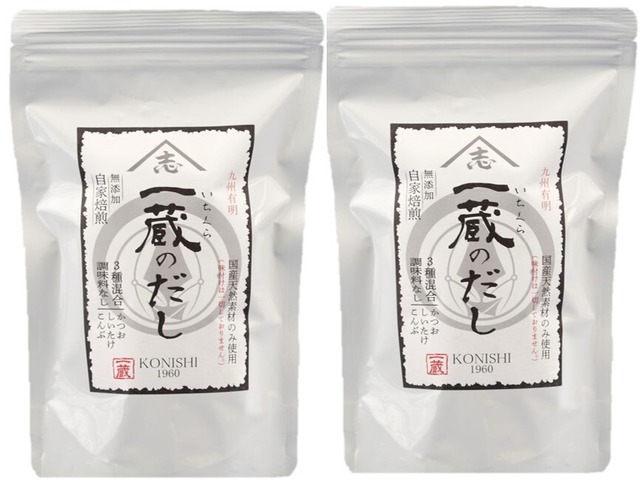 自慢の出汁の本格2種セット 一蔵のだし(白):基本の3種配合 7g×25袋×2セット 一蔵のだし(金):焼きあご配合 8g×22袋×2セット 無添加でこだわりのあるお出汁を、お料理合わせて楽しめる2種出汁セットです。 長い年月をかけて作り出した自慢の出汁を、それぞれの特徴を楽しんでいただける組み合わせです。 一蔵のだし(白):王道の基本出汁です、昆布、鰹節、椎茸の天然の素材のしっかりとしたうま味が感じられます。 おすすめメニュー:煮びたし、すまし汁、茶わん蒸し、など 素材:かつお節(鹿児島産)、昆布(北海道産)、椎茸(大分、熊本産) 一蔵のだし(金):焼きあごが主役の上品ですっきりした甘味とうま味を感じられます。 王道の基本だしです、昆布、かつお節、椎茸の天然の素材のしっかりとしたうま味が感じられます。 おすすめメニュー:うどん、そば、鍋物、おでん、みそ汁、など 素材:あご(九州産)、かつお節(鹿児島産)、昆布(北海道産)、いわし節(九州産)、椎茸(大分、熊本産) ※保存方法についてご注意ください。