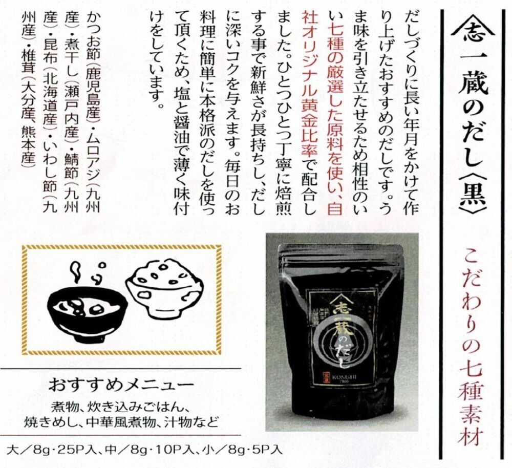 一蔵のだし(黒):うま味を引き立たせるため相性の良い7種の材料を弊社オリジナルの黄金比率でブレンドしました。